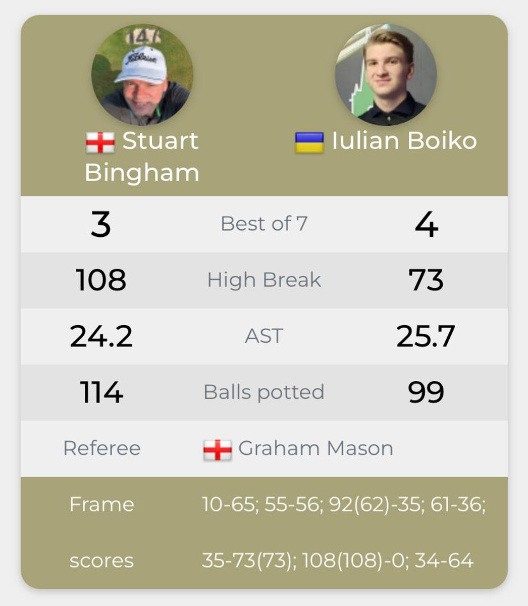 19-річний українець не знітився. Під кінець гри рахунок став 3:2 на його користь. Бінем у шостому фреймі показав клас, забравши його з рахунком 108:0.