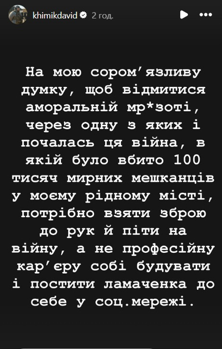 "На мою сором’язливу думку, щоб відмитися аморальній мр*зоті, через одну з яких і почалася ця війна, в якій було вбито 100 тисяч мирних мешканців у моєму рідному місті (Маріуполі, – прим.), потрібно взяти зброю до рук і піти на війну, а не професійну кар’єру собі будувати та постити Ломаченка до себе у соцмережі".