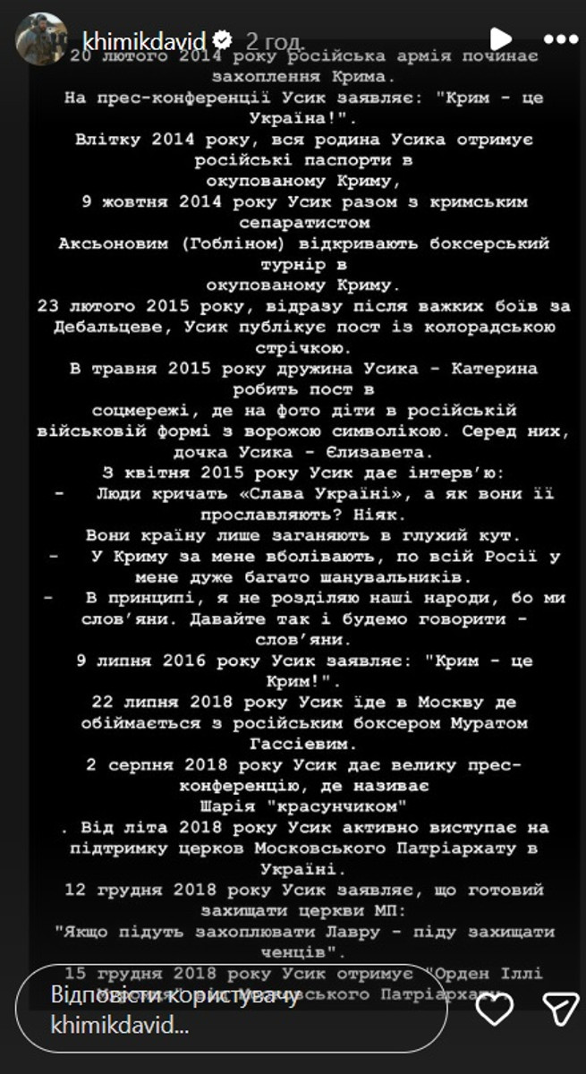 "20 лютого 2014 року російська армія починає захоплення Криму. На пресконференції Усик заявляє: "Крим – це Україна".