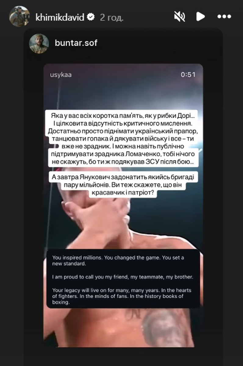 Захисник "Азовсталі" та боєць полку "Азов" Давид "Хімік" Касаткін різко розкритикував Олександра Усика (24-0, 15 КО) та тих, хто його підтримує, після переможного бою українця проти Даніеля Дюбуа.