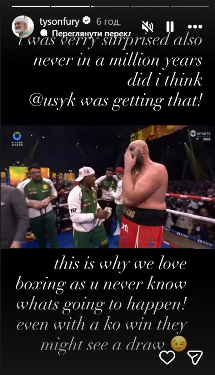 Ось чому ми любимо бокс — ти ніколи не знаєш, що станеться! Навіть коли ти переможеш нокаутом, вони нарахують нічию", — написав Ф’юрі.