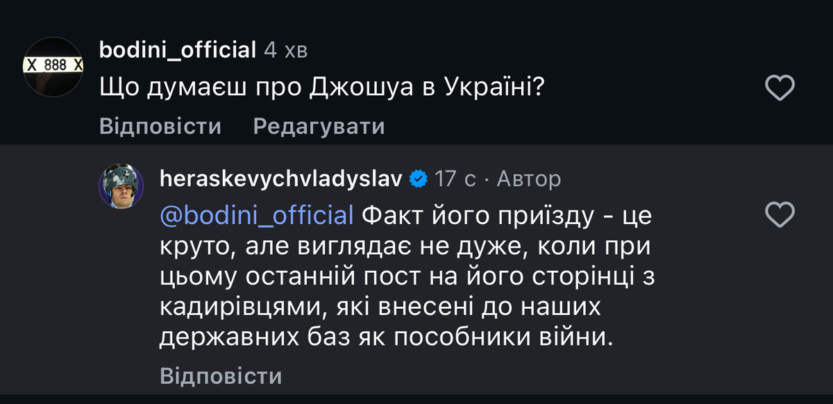 Гераскевич – про візит Джошуа в Україну: Це круто, але його пост з кадирівцями виглядає не дуже