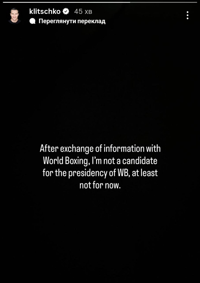 "Після обміну інформацією з World Boxing, я не є кандидатом на посаду голови організації. Принаймні, поки що", – написав Кличко.