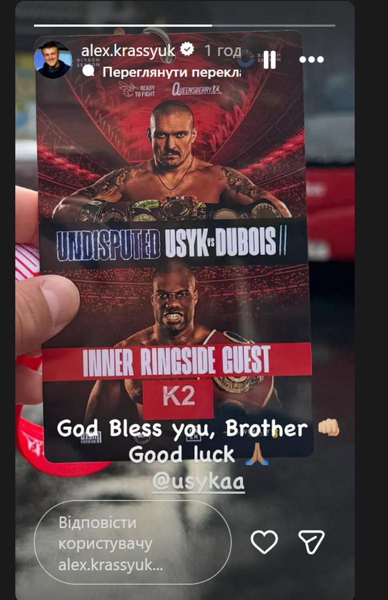 Український промоутер Олександр Красюк прибув на "Вемблі" у Лондоні для перегляду поєдинку чемпіона WBC, WBA, WBO, IBO у надважкій вазі Олександра Усика (23-0, 14 КО) з володарем титулу IBF британцем Даніелем Дюбуа (22-2, 21 КО).