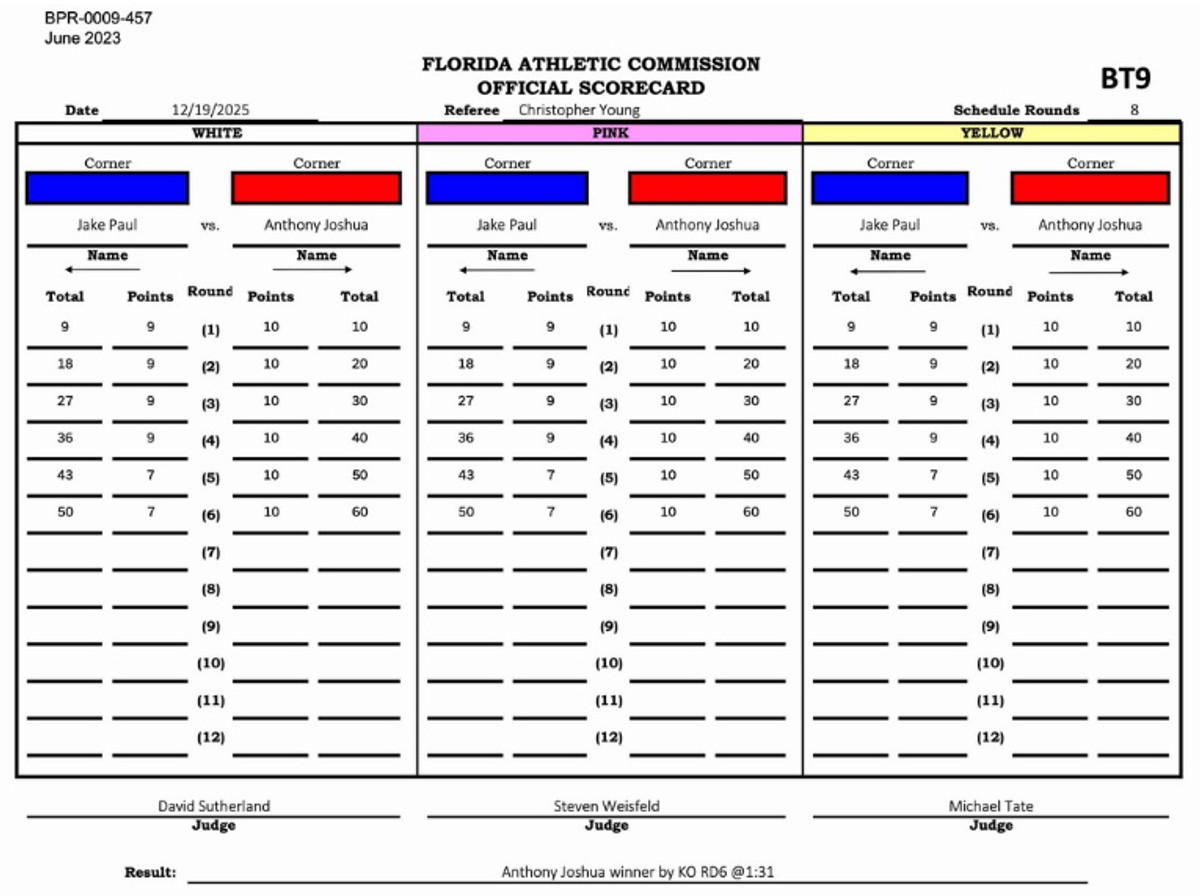 Атлетична комісія Флориди нарешті опублікувала суддівські записки поєдинку між Ентоні Джошуа та Джейком Полом.