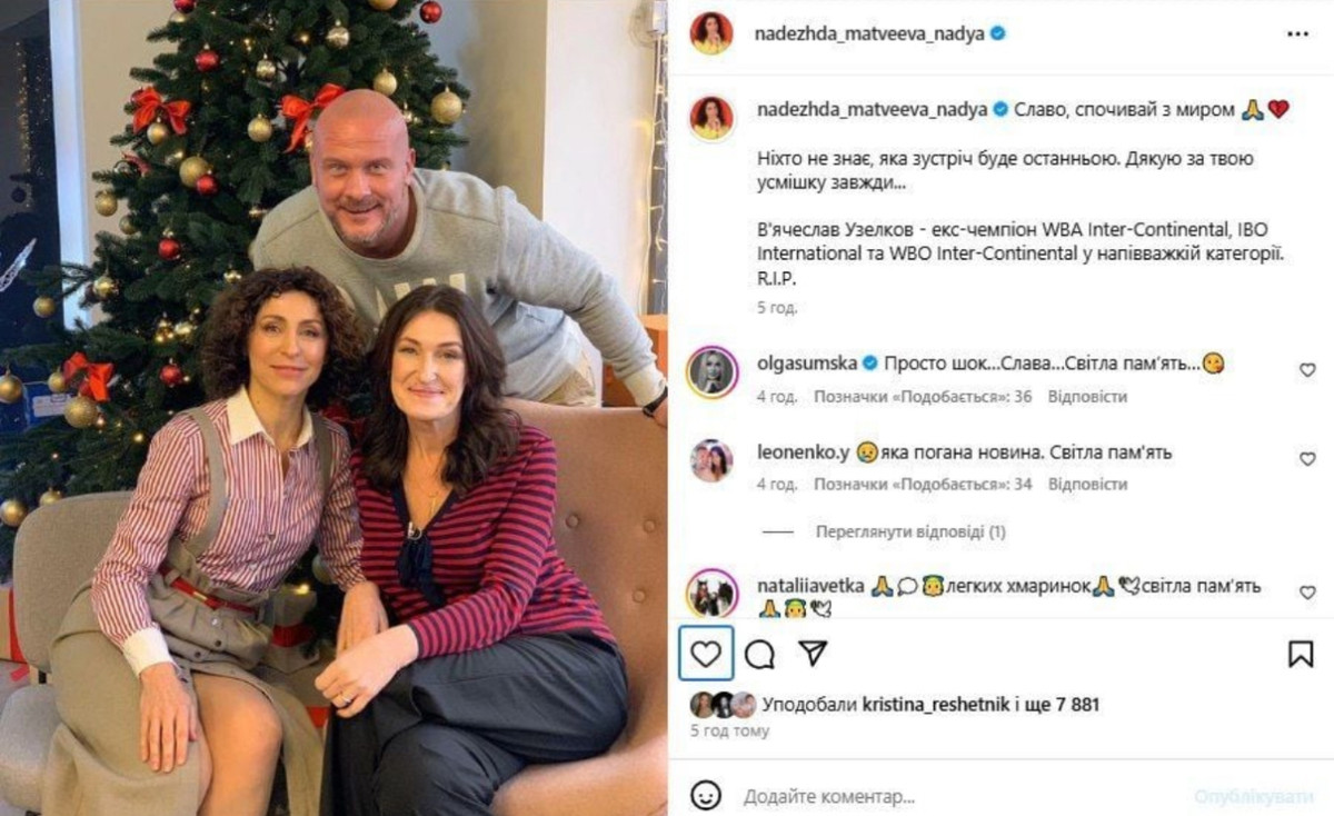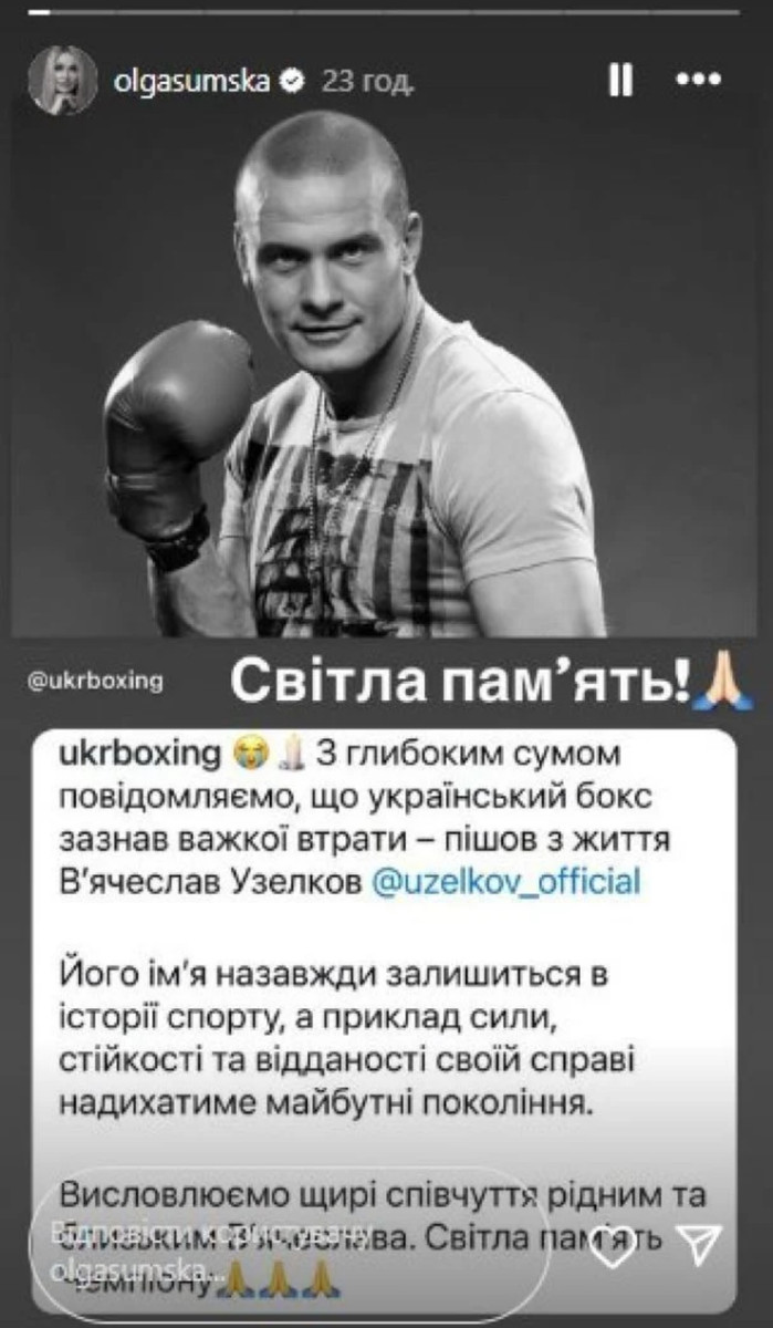 "Славо, спочивай з миром. Ніхто не знає, яка зустріч буде останньою. Дякую за твою усмішку завжди... В'ячеслав Узелков - ексчемпіон WBA Inter-Continental, IBO International та WBO Inter-Continental у напівважкій категорії. R.I.P."