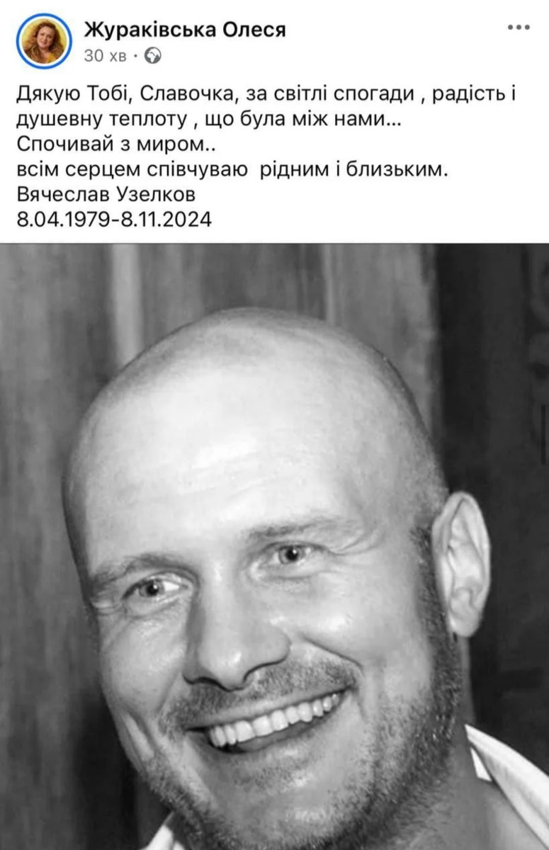 "Дякую тобі, Славочко, за світлі спогади, радість і душевну теплоту, що була між нами... Спочивай з миром. Всім серцем співчуваю рідним і близьким. В'ячеслав Узелков. 8.04.1979-8.11.2024".