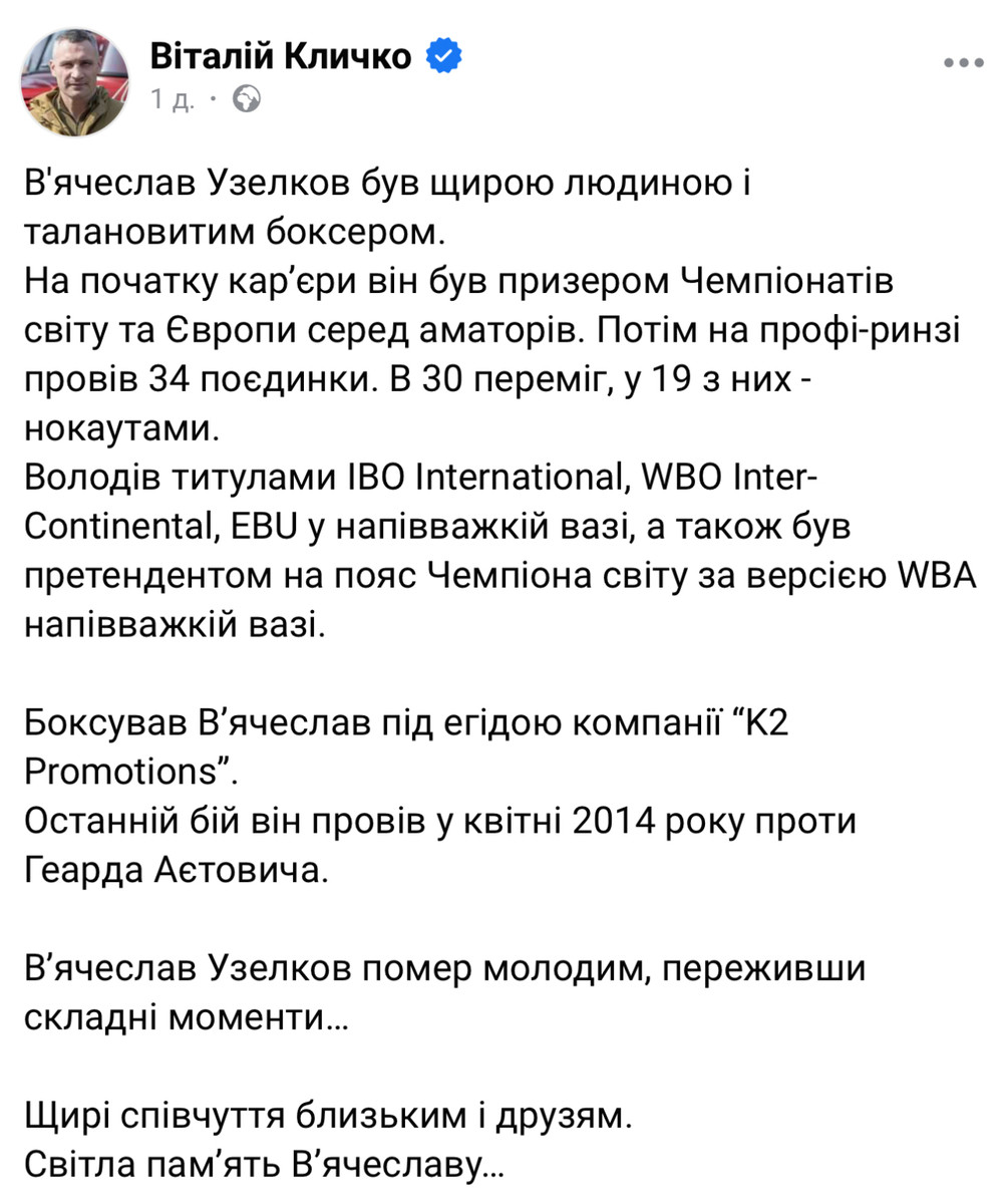 Ексчемпіон світу та мер Києва Віталій Кличко відреагував на раптову смерть колишнього чемпіона WBA Inter-Continental, IBO International і WBO Inter-Continental у напівважкій вазі В’ячеслава Узелкова.