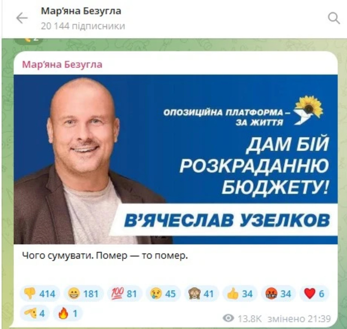Нардепка Мар'яна Безугла цинічно відреагувала на смерть Узелкова.