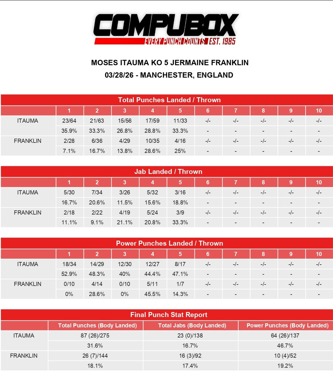 Британець Мозес Ітаума (14-0, 12 КО) переміг досвідченого американця Джермейна Франкліна (24-3, 15 КО).