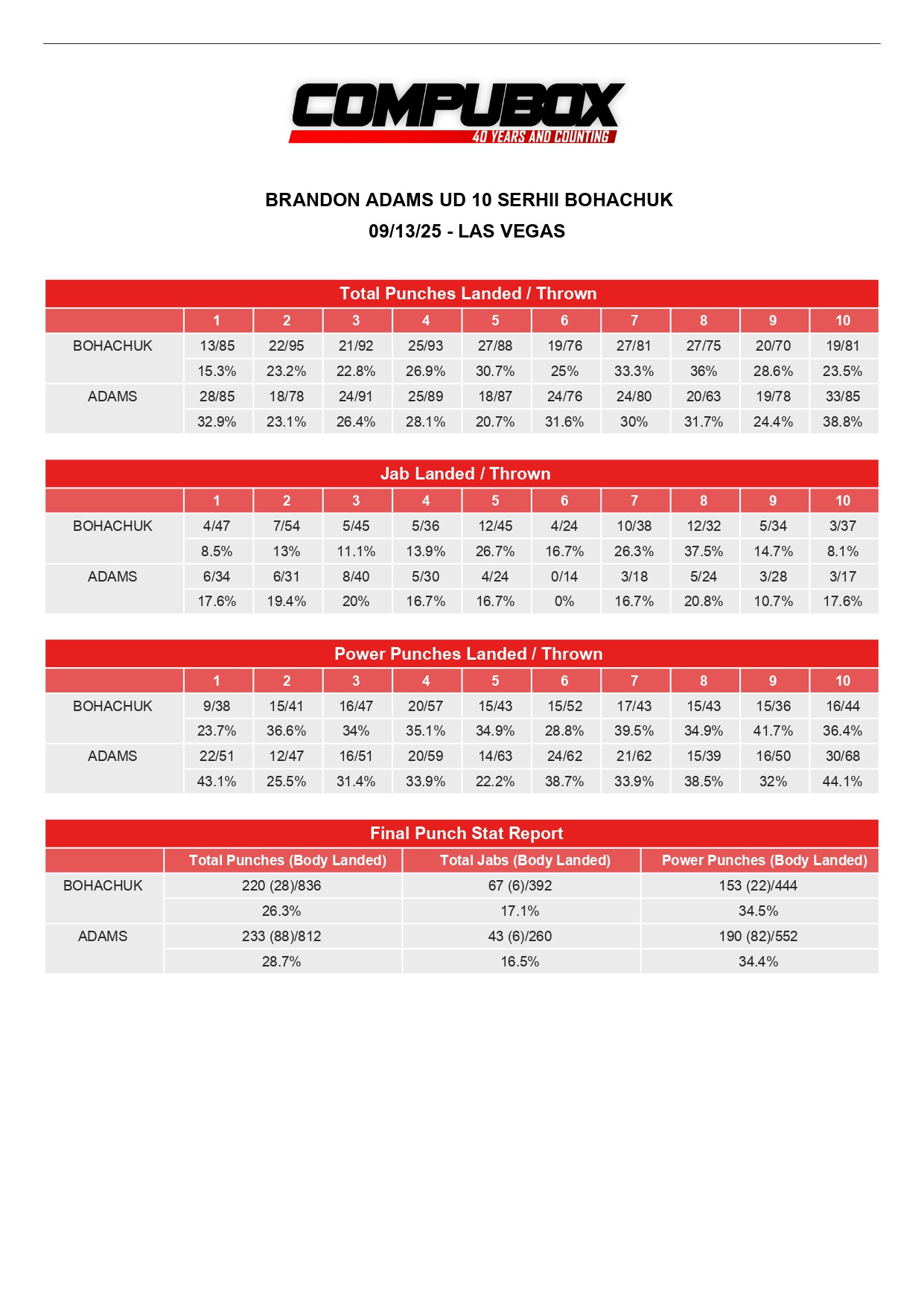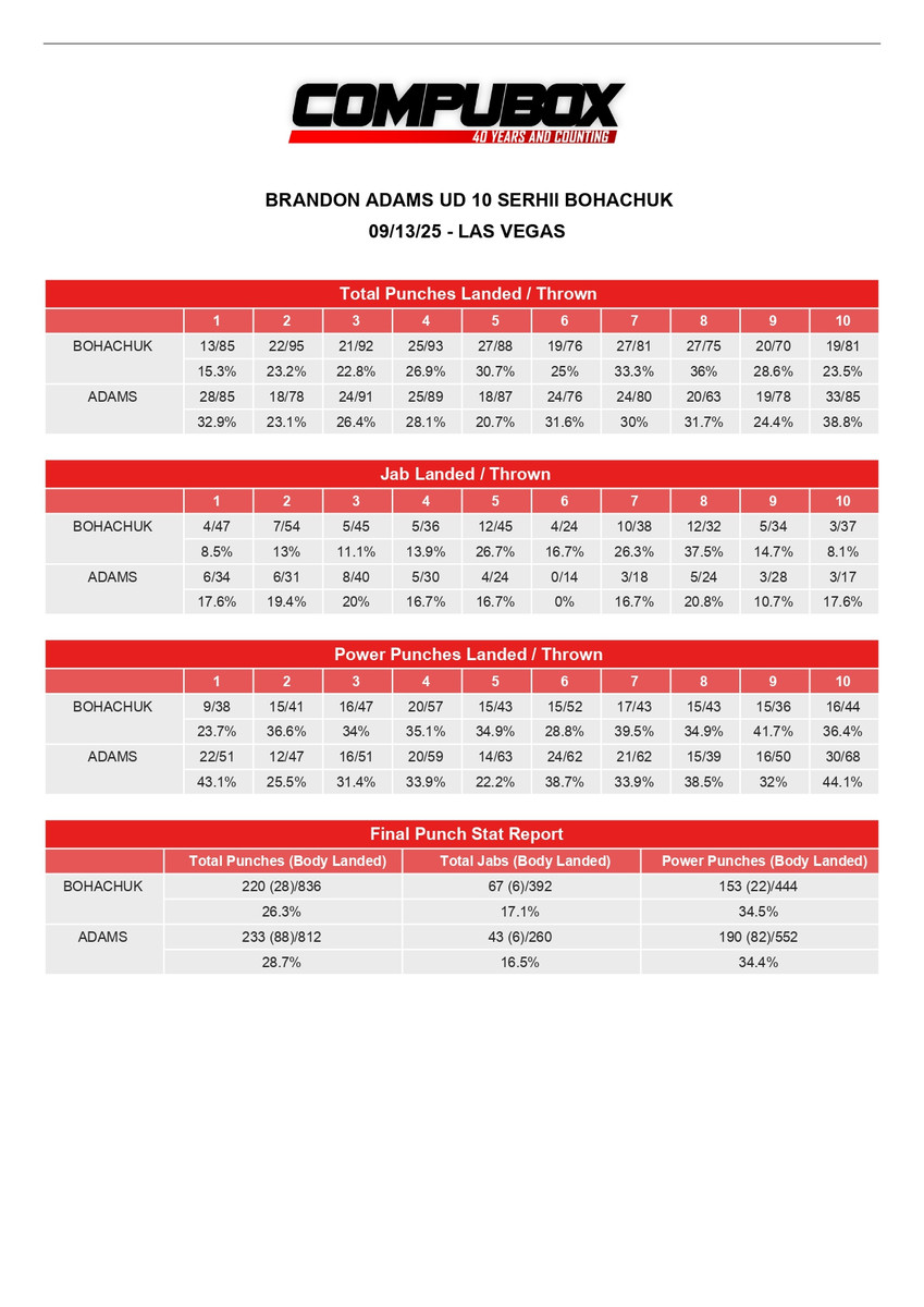 Згідно з підсумковою статистикою ударів, українець наніс більше ударів (836-812), але Адамс був точнішим (233-220).