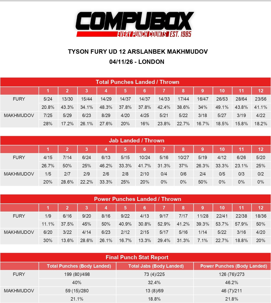 Він загалом доніс до цілі 199 ударів. Ф'юрі влучив 73 джеби (4 у тіло), а також 126 силових, з яких 76 припали в корпус.