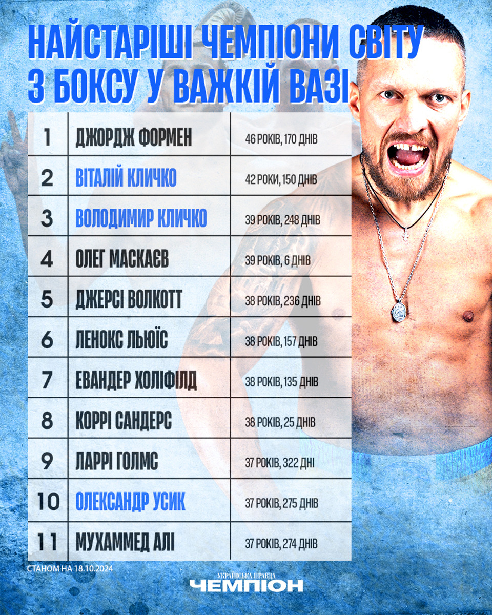 18 жовтня уродженцю Сімферополя виповнилося 37 років і 275 днів. Отже, український чемпіон випередив на 10 сходинці легендарного Мухаммеда Алі, який втратив чемпіонський пояс у віці 37 років і 274 днів.