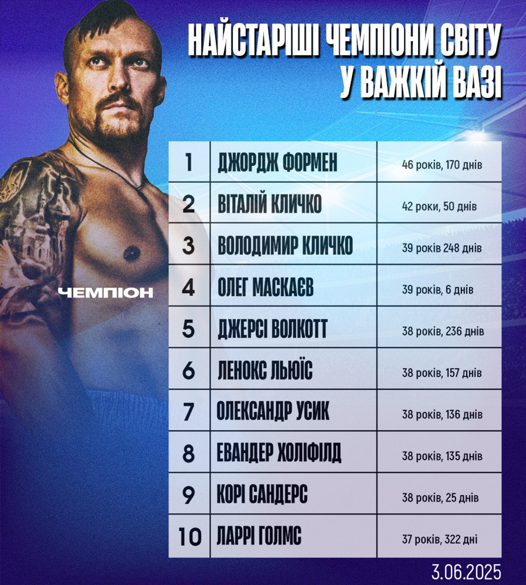 Сьогодні, 3 червня, український боксер важкої ваги, чемпіон світу за версіями WBC, WBA, WBO Олександр Усик випередив легендарного Евандера Холіфілда в рейтингу 10 найстаріших володарів титулу у найпрестижнішому дивізіоні. Зараз Усик, якому виповнилося 38 років і 136 днів, посідає сьоме місце в цьому рейтингу. На восьмому місці Холіфілд (38 років, 135 днів), на дев’ятому – Коррі Сандерс з ПАР (38 років, 25 днів), на десятому – американець Ларі Голмс (37 років, 322 дні), на 11-му – Мохаммед Алі (37 років, 274 дні).