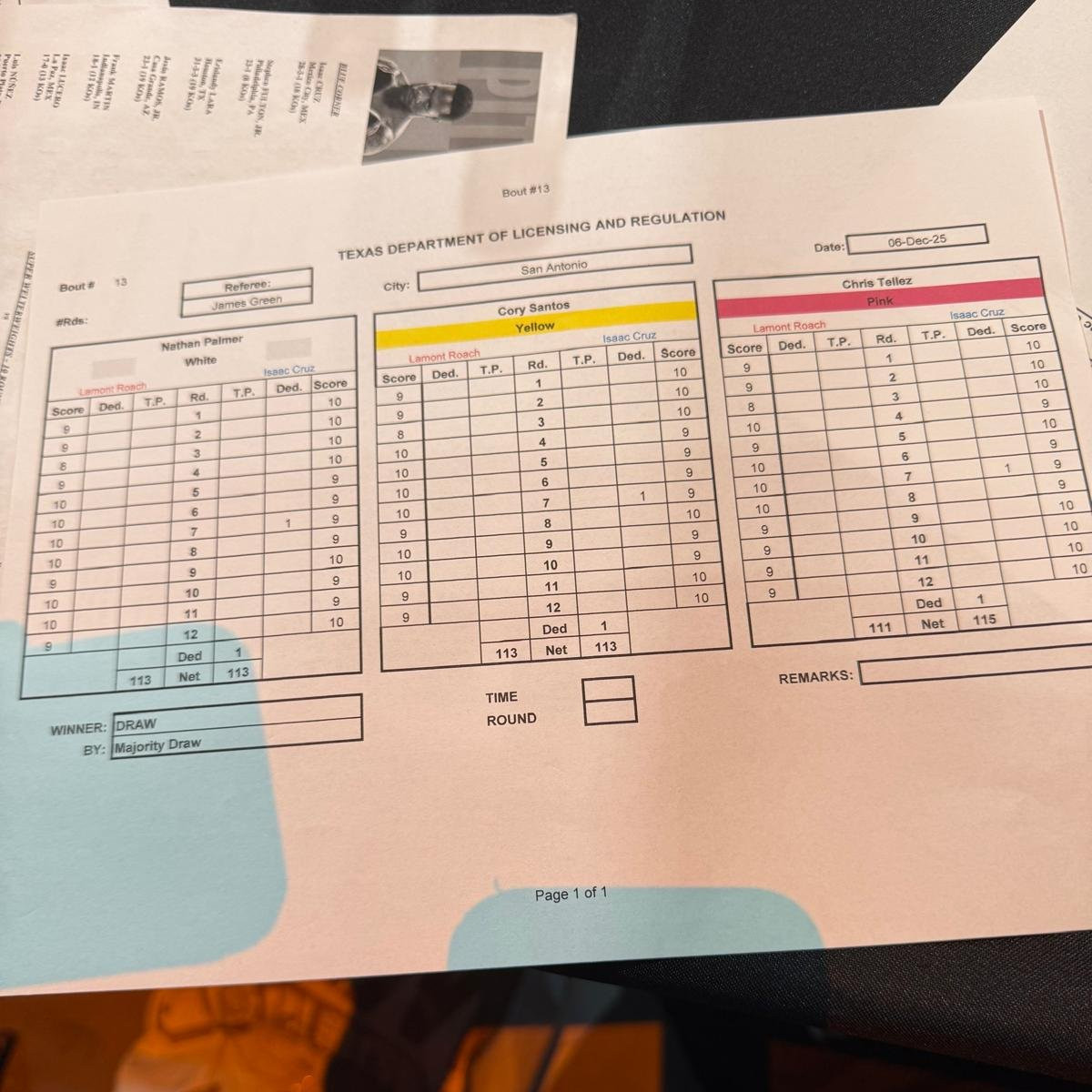 Поєдинок закінчився внічию: 115-111 Ісааку Крузу та 113-113. Підсумкове рішення – нічия розділеним рішенням суддів.