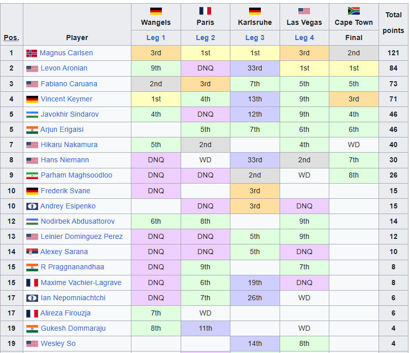 Норвежець на кожному етапі входив у трійку призерів. Загалом він здобув 121 очко. Аронян завдяки успіхам на останніх двох турнірах став другим.