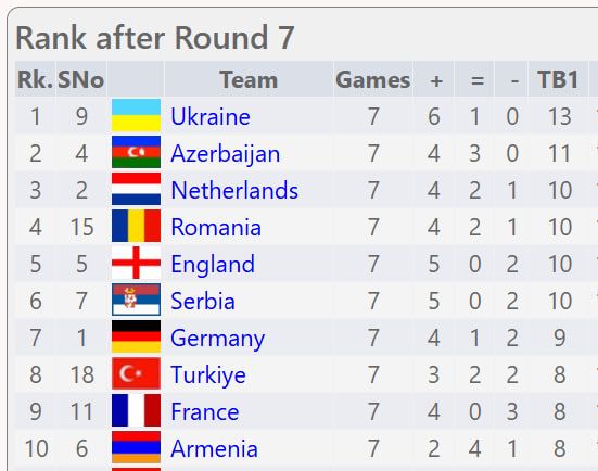 Жінки ділять 2-3 місце з Німеччиною. На четвертій сходинці йде Грузія-1, з якою проведуть поєдинок українські шахістки.