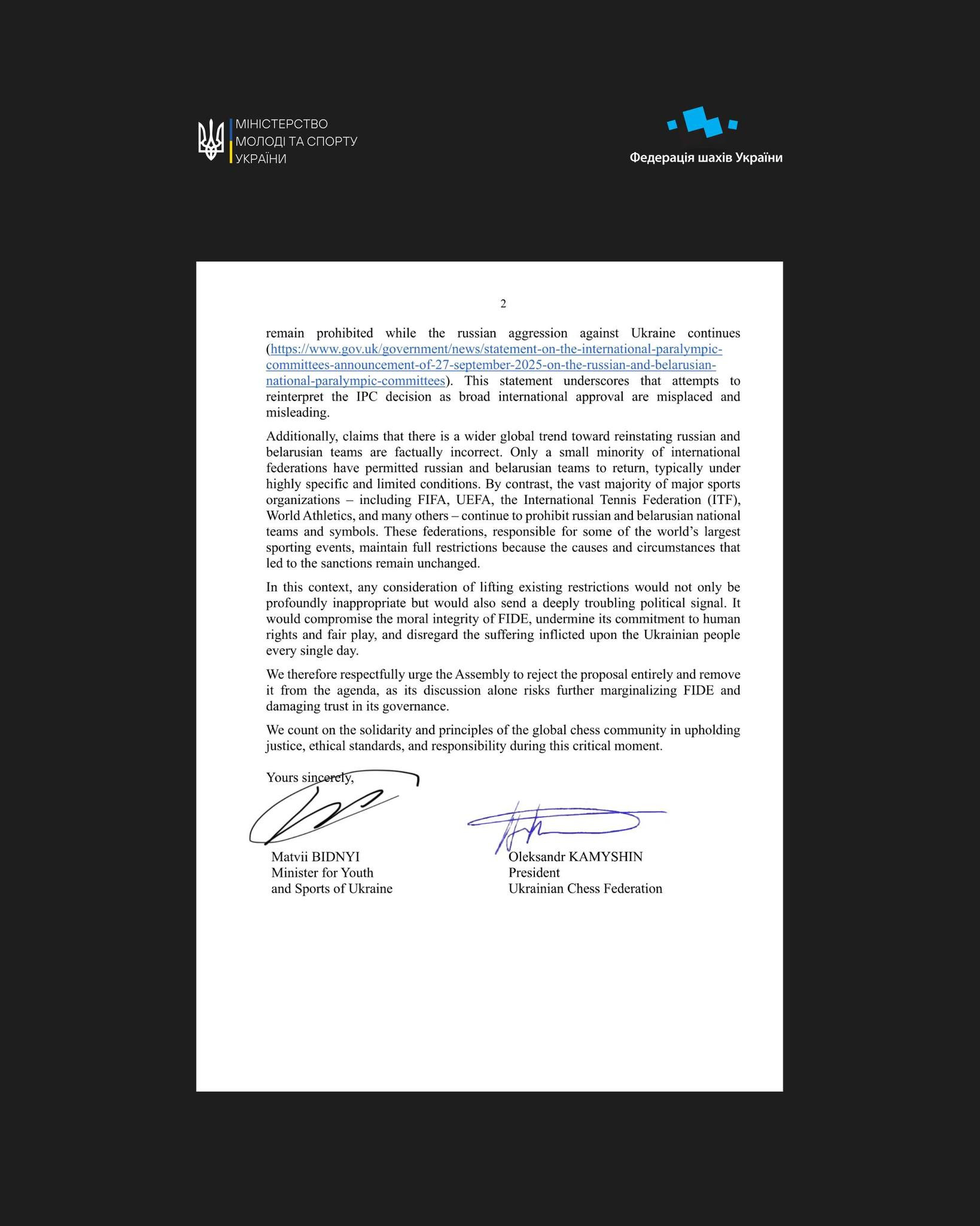 Зазначається, що звернення підписали не тільки представники шахової спільноти, а й міністр молоді та спорту України Матвій Бідний.