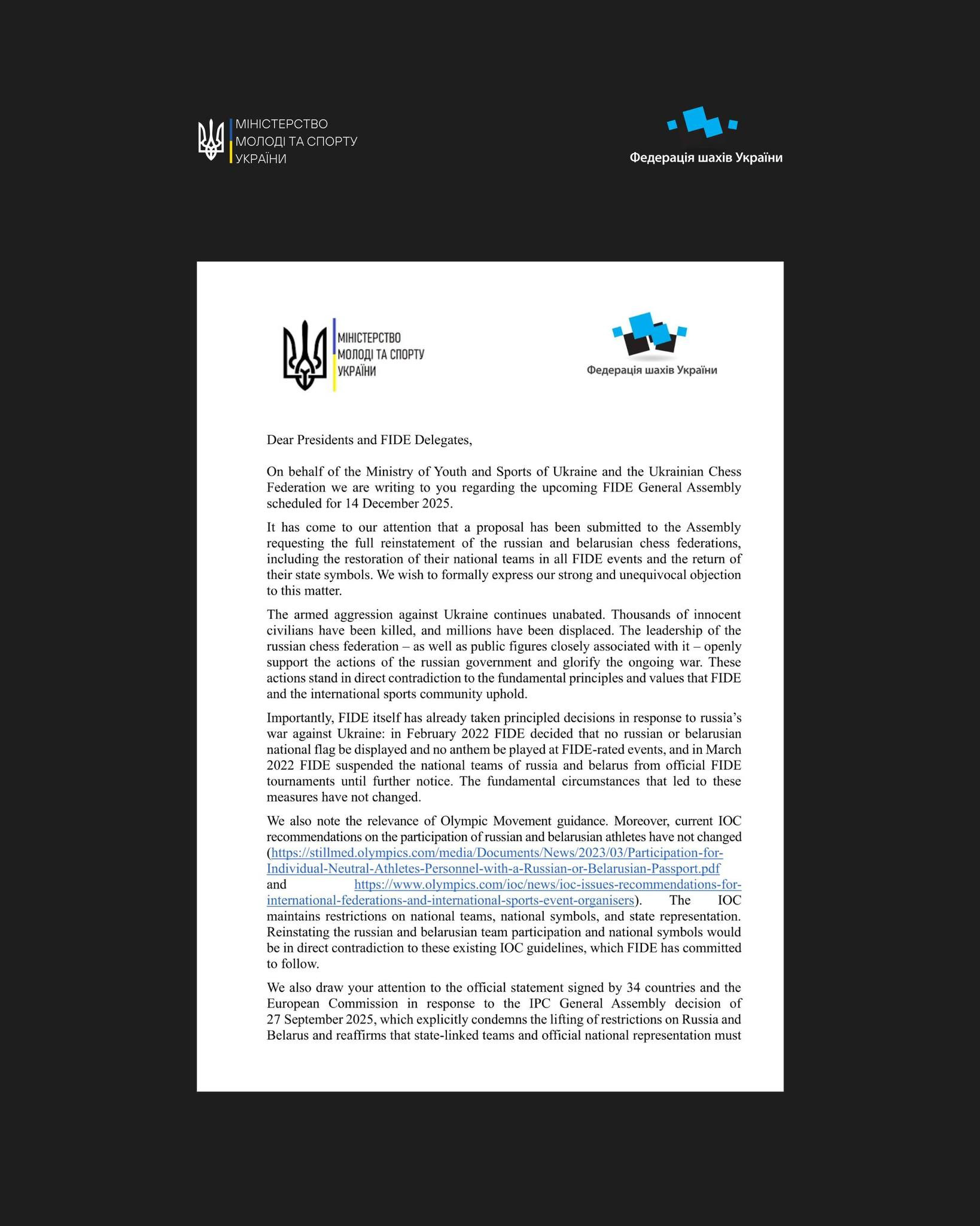 "Українська сторона наголошує, що збройна агресія Росії проти України триває, призводячи до тисяч загиблих мирних жителів і мільйонів вимушених переселенців. Водночас керівництво федерації шахів Росії та пов'язані з нею публічні діячі відкрито підтримують політику російської влади та війну, що, за оцінкою України, суперечить базовим принципам і цінностям ФІДЕ та міжнародного спортивного руху", – наголосили у федерації.