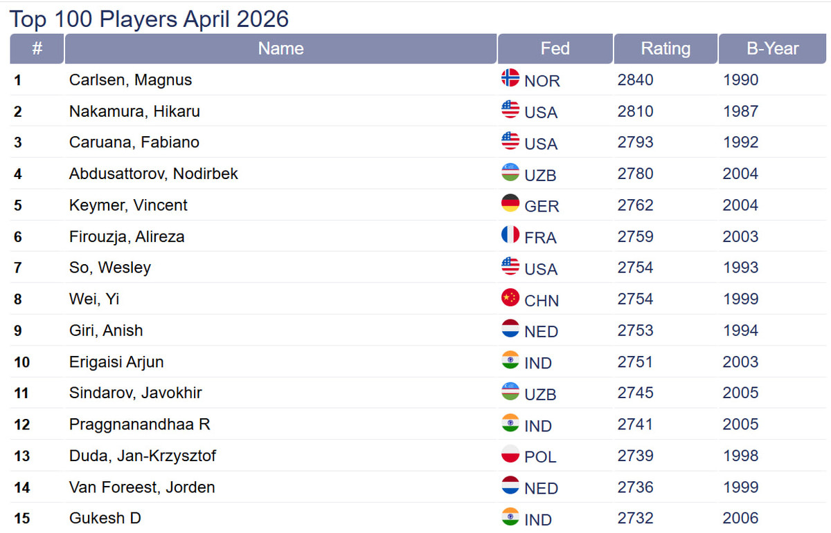 Список продовжує очолювати норвезький шахіст Магнус Карлсен із 2840 очками. Він є лідером рейтингу FIDE з 2011 року.