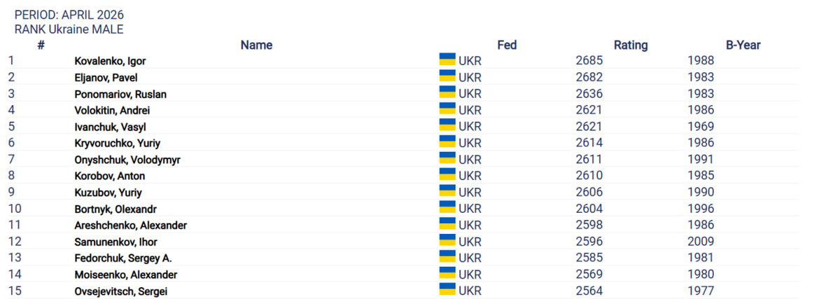 Коваленко, Ельянов і Пономарьов досягли прогресу в оновленому рейтингу ФІДЕ