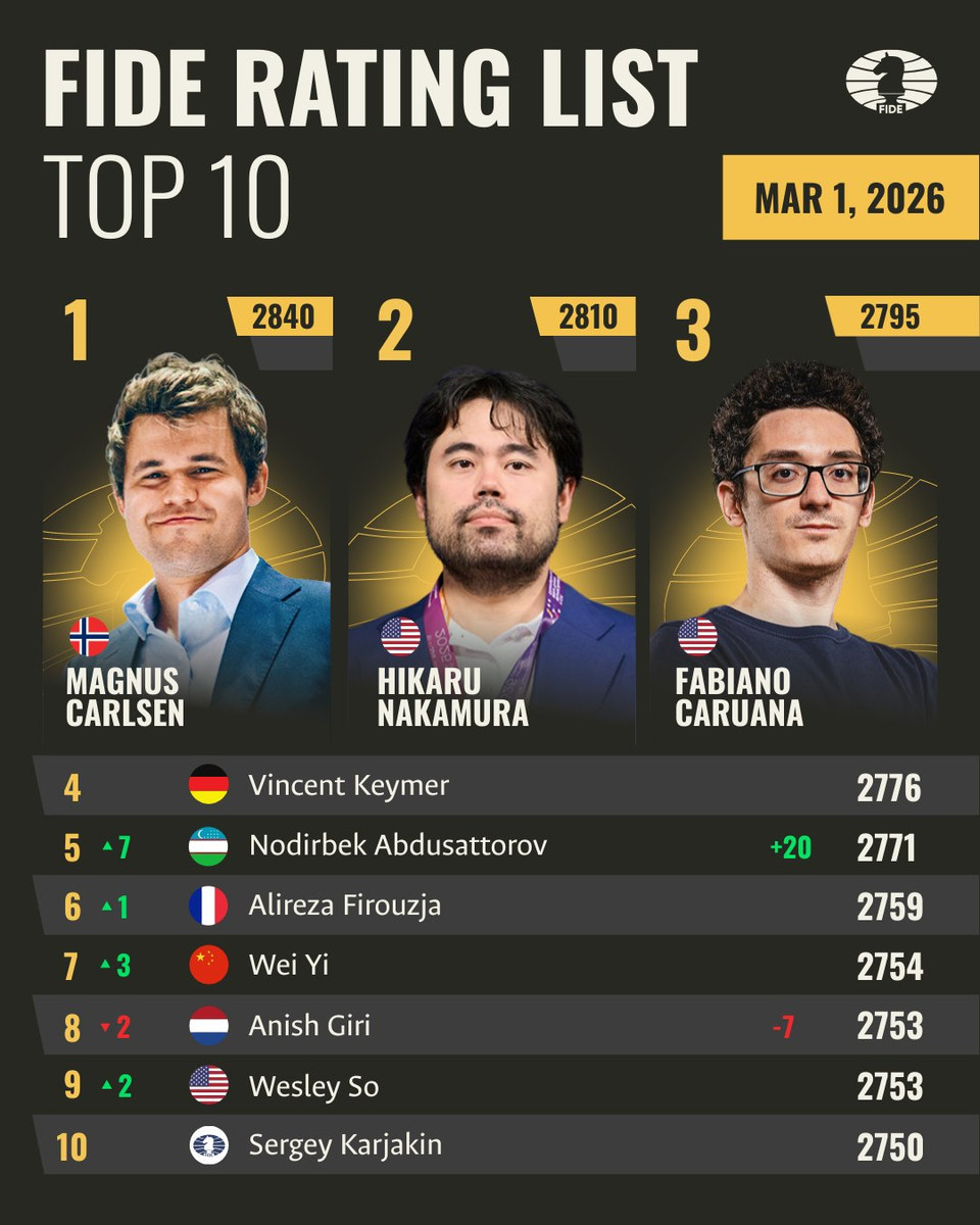 Список продовжує очолювати норвезький шахіст Магнус Карлсен із 2840 очками. Він очолює рейтинг FIDE з 2011 року.