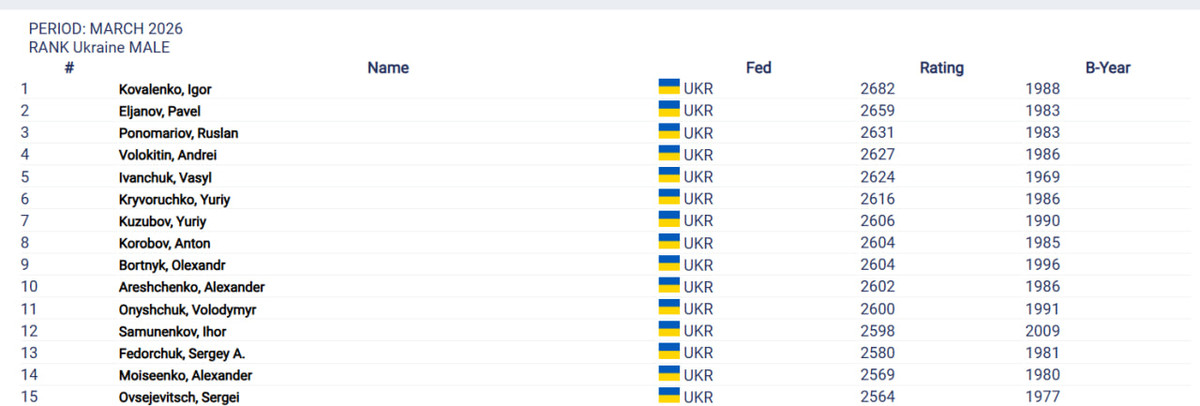 Рейтинг українських шахістів станом на березень 2026-го:
