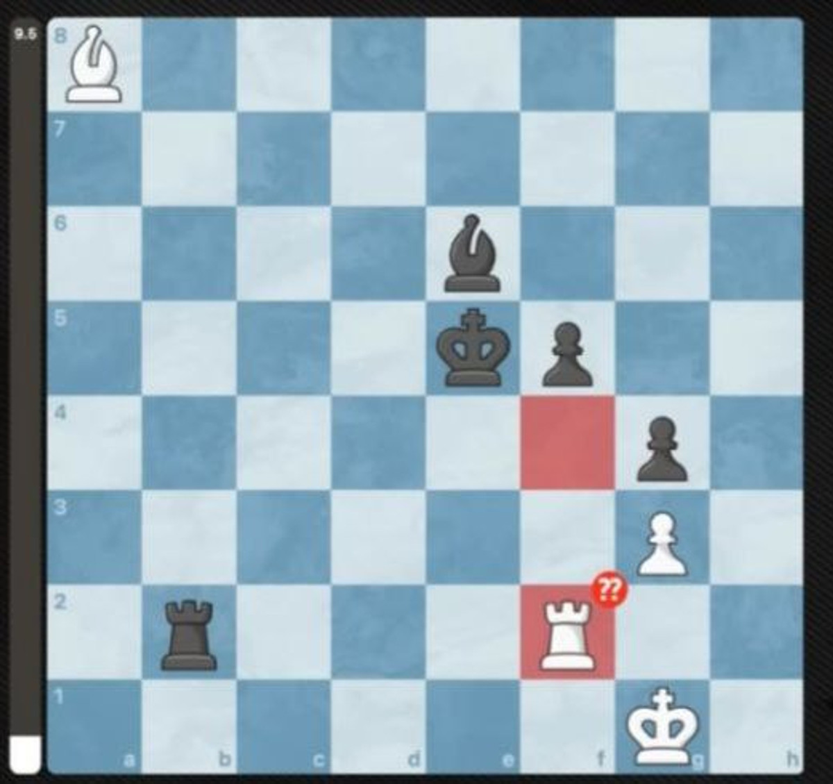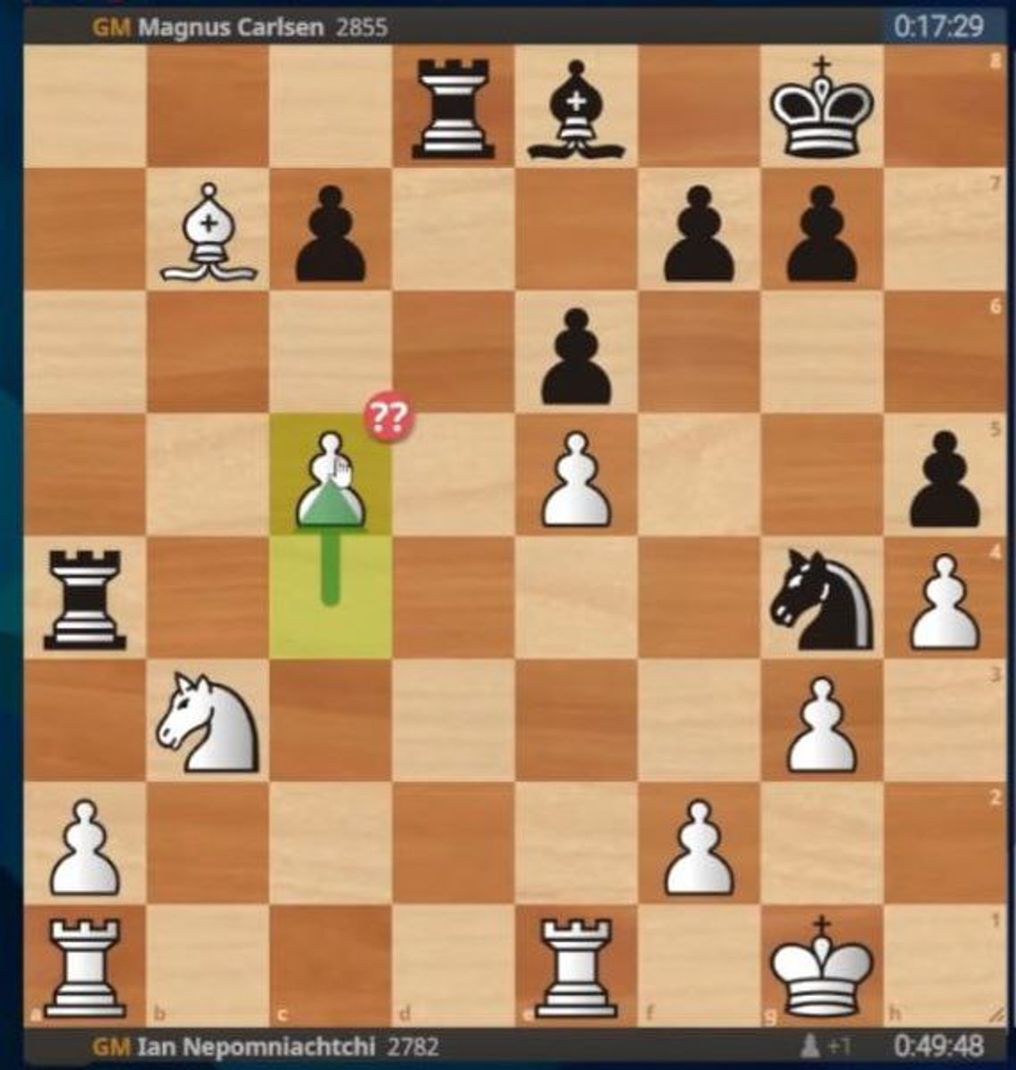 Саме так сталось у дев’ятій партії матчу за чемпіонство світу між Непомнящим та Карлсеном. Після того, як росіянин відіграв пішака слоном, норвежець двинув туру а4, а суперник зробив хід, який фактично програв партію. С5 від Непомнящего непрозоро натякнула Магнусу взяти у "коробочку" слона білих, що чемпіон світу із задоволенням зробив, відповівши с6. Білим варто було забрати слона з половини дошки чорних, розміняти деякі фігури та придивлятись до пішака на с7, який перетворився б у відсталого. Норвежець половину партії чекав цього ходу й дочекався – слона було успішно виграно, а контргра білих за рахунок прохідного пішака вже нічого не вирішувала. Сам Магнус на пресконференції після завершення партії назвав хід с5 абсурдним.