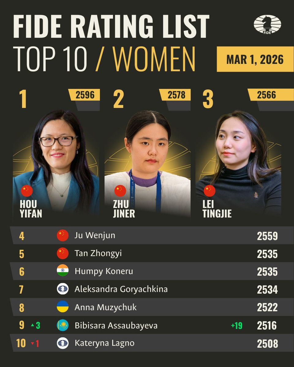 Зазначимо, що перші чотири місця світового рейтингу утримують представниці Китаю: Хоу Іфань, Чжу Цзінер, Лей Тінцзе та Джу Веньцзюнь.