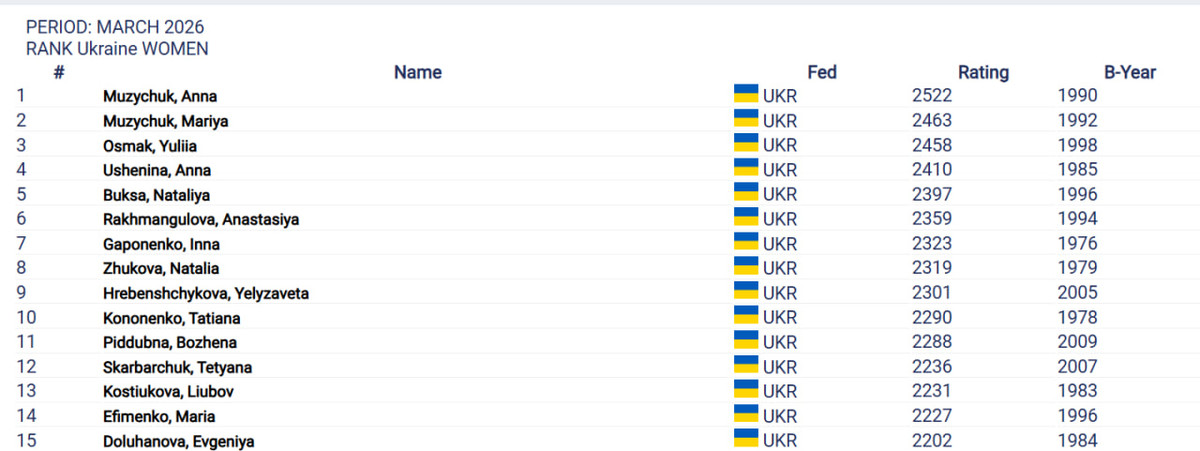 Лідером серед представників України є Анна Музичук. Вона утримує восьму сходинку з показником 2522.