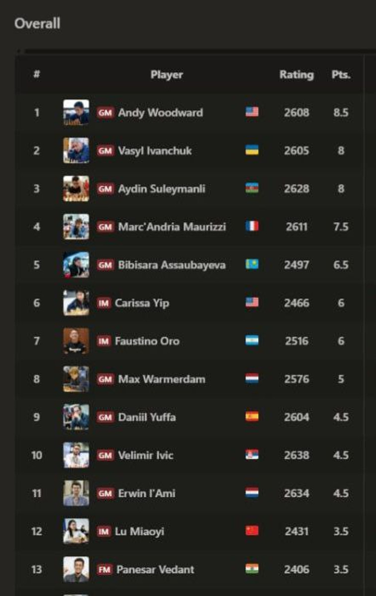 Раніше Іванчук здолав Макса Вармердама та зіграв унічию з Ведантом Панесаром.