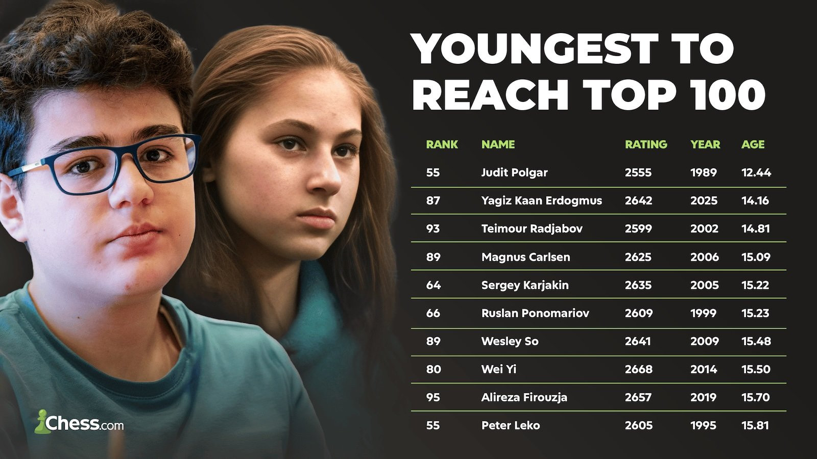 Лише гросмейстерка Юдіт Полгар, коли-небудь потрапляла до першої сотні в молодшому віці.