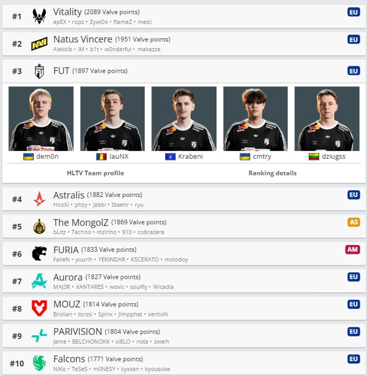 За цей турнір FUT заробили +256 VRS очок і вийшли на третє місце у світі у рейтингу HLTV, водночас "Народженні перемагати" розташувалися на другій сходинці.