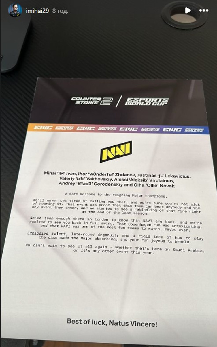 Вибуховий талант, винахідливість у пізніх раундах та чітке розуміння того, як грати в гру, зробили турнір захоплюючим, а ваш виступ радісним для перегляду. Ми з нетерпінням чекаємо, щоб побачити все це знову – хай то тут, у Саудівській Аравії, чи на будь-якому іншому заході цього року. Бажаємо успіху, Natus Vincere!", — йдеться в письмі.