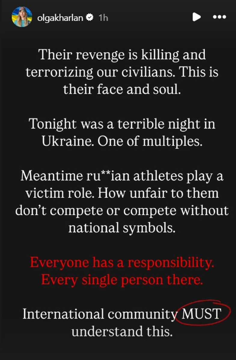 Тим часом російські спортсмени грають роль жертви. Як несправедливо до них, що вони не змагаються чи змагаються без національної символіки. Кожен несе відповідальність. Кожна людина там. Міжнародна спільнота повинна це розуміти", – написала Харлан.