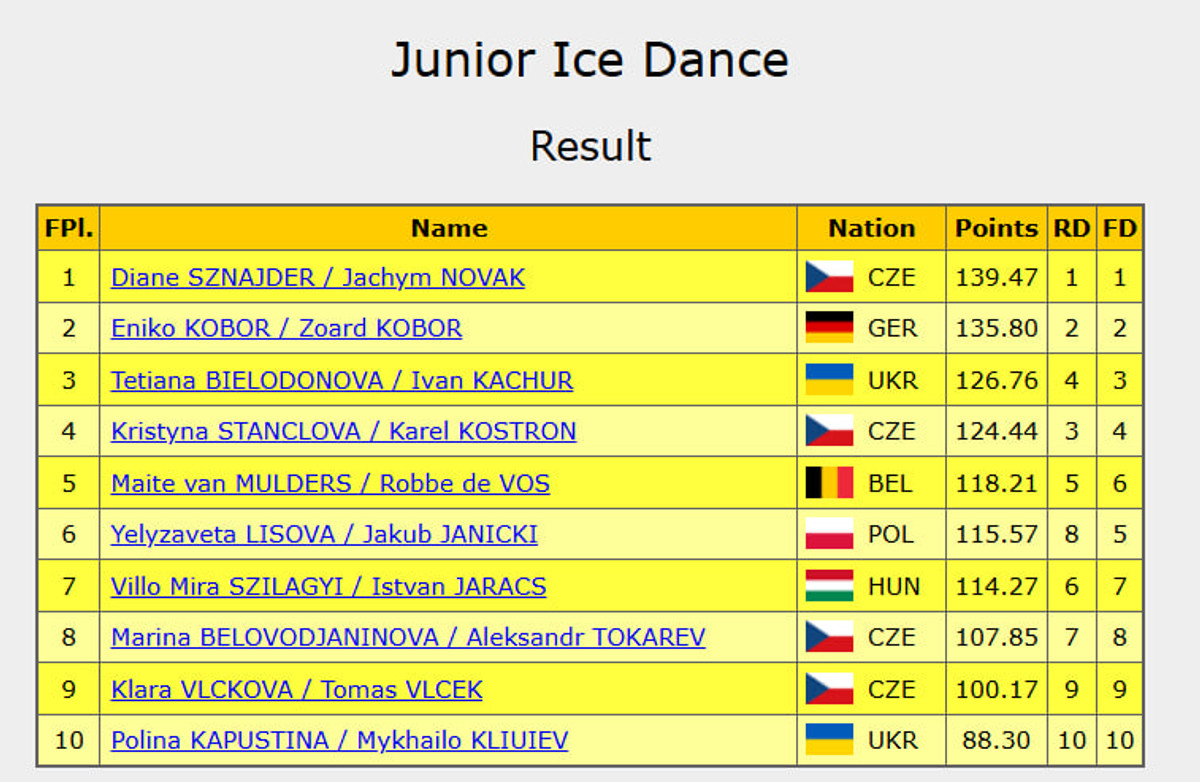 У танцях на льоду вони набрали 126.76 бали. Переможцями стали Діане Шнайдер та Йоахим Новак із Чехії – 139.47. Срібло здобули німецькі фігуристи Еніко та Жоарт Кобор, якы набрали 135.80.