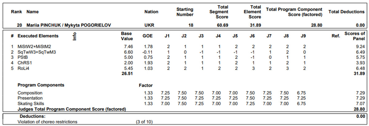 У підсумку Пінчук та Погорєлов пройшли в довільну програму змагань з 20-го місця, програвши лідерам ритм-танцю, дуету з Італії Шарлен Гіньяр та Марко Фаббрі 23,54 бала.