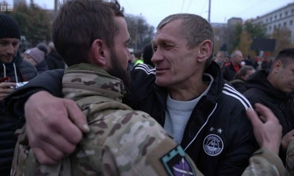 За декілька днів до цього росіяни вивели своє 30-тисячне угрупування з міста. Особливо Дейва схвилював кадр, на якому одягнений в куртку з логотипом клубу Aberdeen літній херсонець, дуже емоційно, буквально зі сльозами на очах, обіймає українського військового.