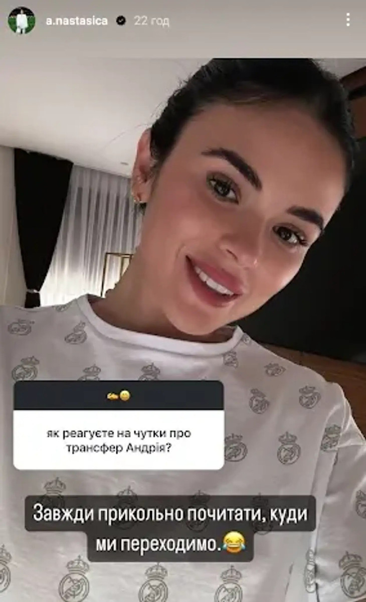 Відповідь на запитання підписника "Як реагуєте на чутки про трансфер Андрія?" вона розмістила у своєму Instagram.