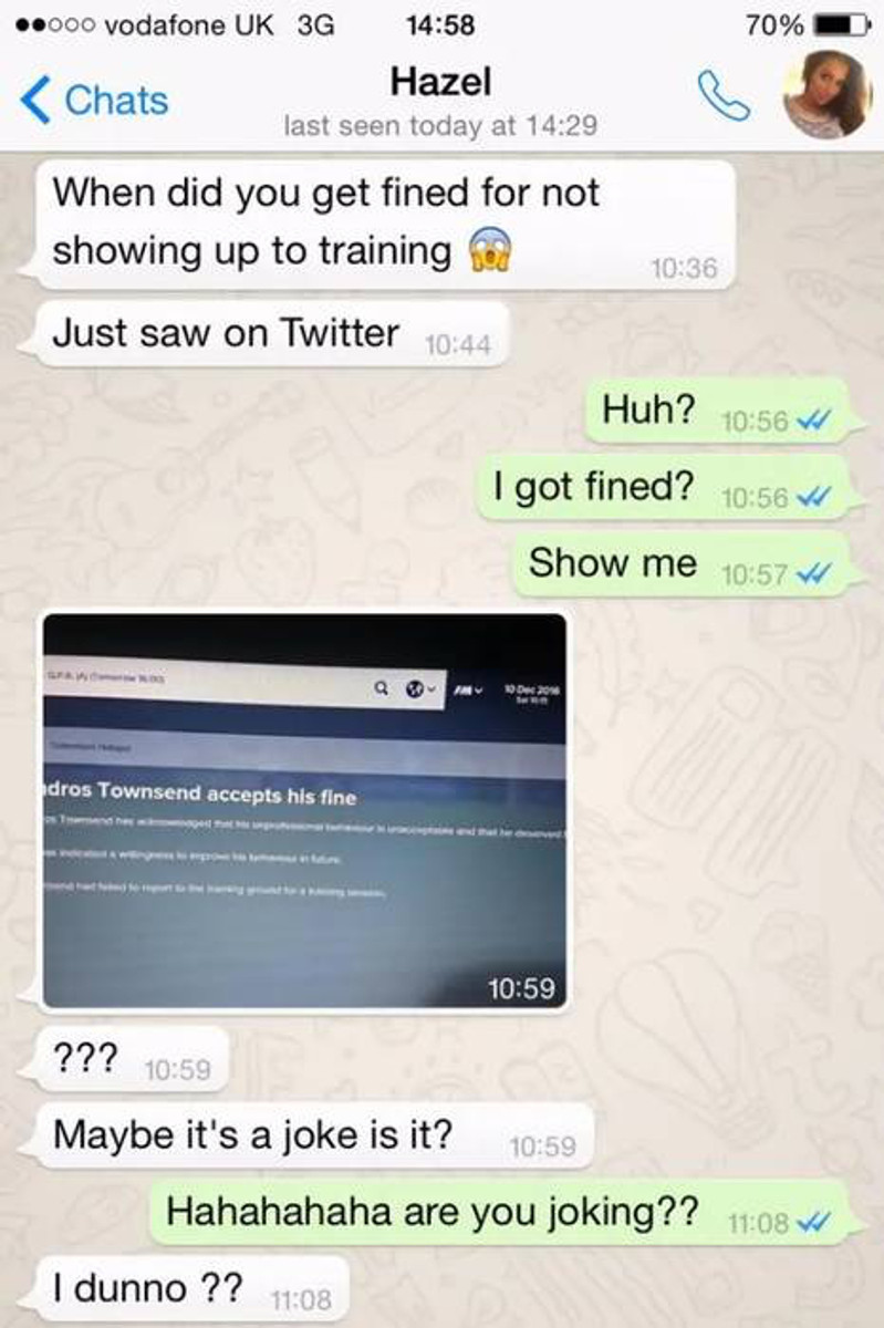 Дев'ять років тому, коли футболіст грав за Тоттенгем, один із користувачів Twitter опублікував скріншот гри, де показано, що Андрос був оштрафований за "неявку на тренування". Це викликало занепокоєння Хейзел, і вона написала йому: "Коли тебе оштрафували за неявку на тренування? Я щойно побачила це у Twitter".