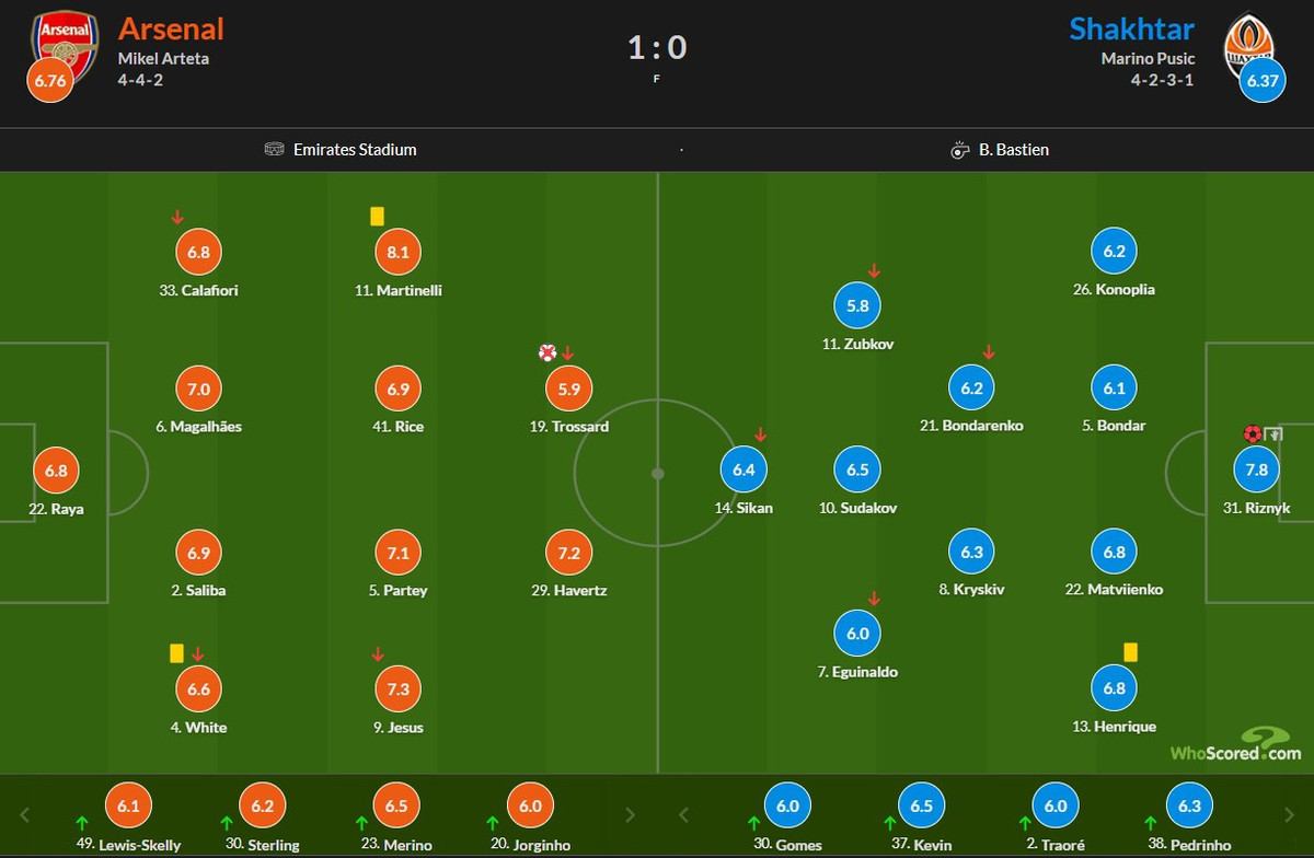 У Арсенала гірше за всіх виступив півзахисник Леандро Троссар, який отримав оцінку 5.9. Зазначимо, що бельгієць не зміг реалізувати пенальті на 77-й хвилині, який відбив голкіпер "гірників" Дмитро Різник.