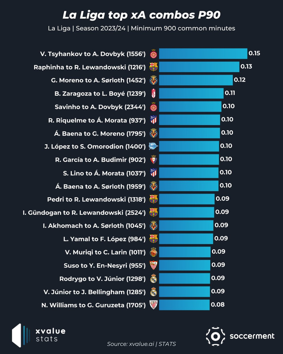 Українці очолили рейтинг найкращих дуетів футболістів за очікуваними асистами (xA) один на одного за 90 хвилин матчу у цьому сезоні чемпіонату Іспанії.