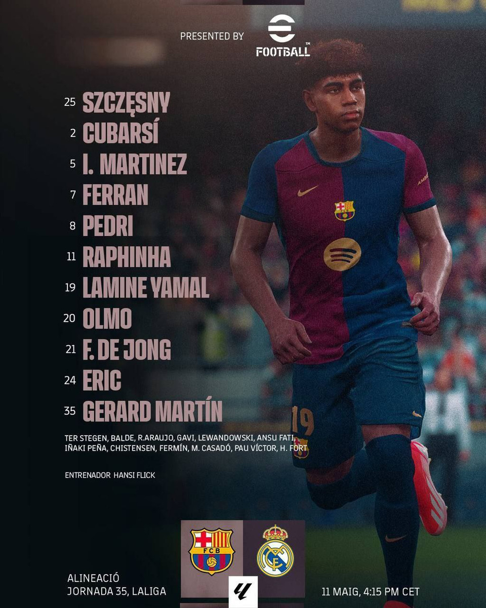 Барселона: Щенсни, Мартін, Кубарсі, Іньїго Мартінес, Ерік Гарсія, Педрі, де Йонг, Ольмо, Рафінья, Ямал, Ферран Торрес