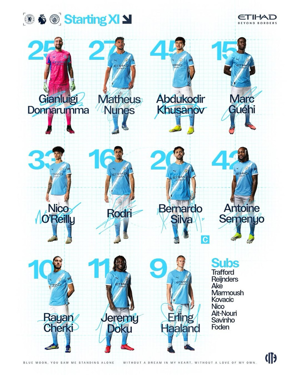 Манчестер Сіті: Доннарумма – Нунес, Хусанов, Геї, ОРайлі, Родрі, Сілва, Семеньйо, Шеркі, Доку, Голанд.