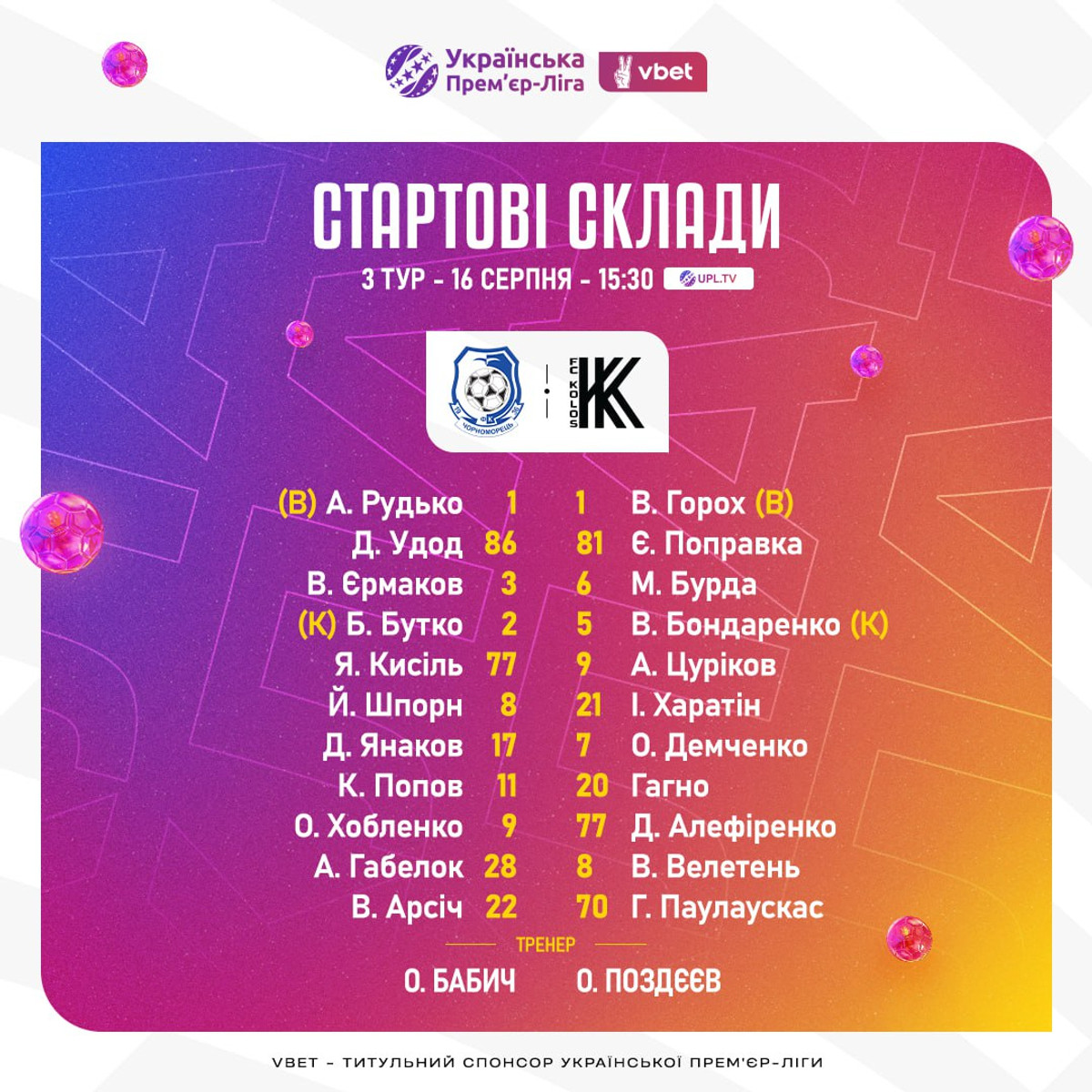 Одеський Чорноморець та Колос із Ковалівки назвали стартові склади на матч третього туру УПЛ сезону-2024/25
