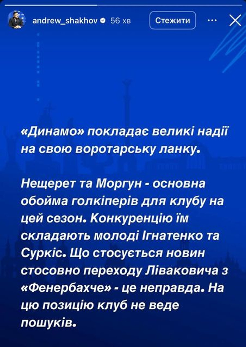 Що стосується новин стосовно переходу Ліваковича з Фенербахче – це неправда. На цю позицію клуб не веде пошуків", – написав у Instagram директор медіадепартаменту Динамо Андрій Шахов.