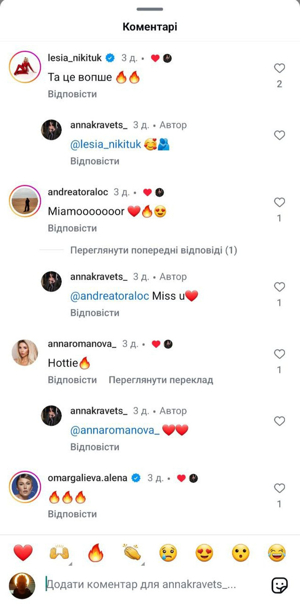 Подруги красуні накидали під постом "вогників" та інших емодзі, які виражають захоплення формами Анни. Але найдотепніший коментар лишила дружина Максима Третьякова: "Якісне м'яско". Також повз таке пікантне фото не змогла пройти відома телеведуча Леся Нікітюк.
