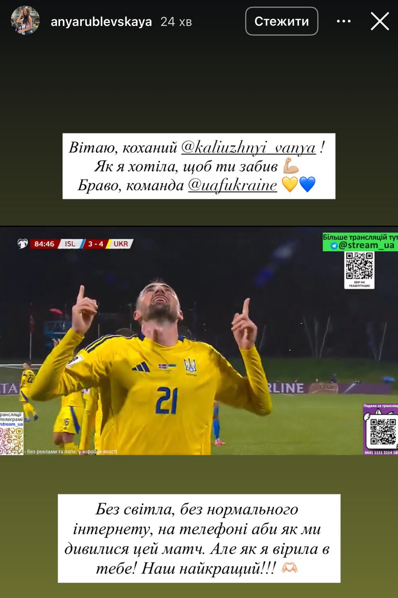 Без світла, без нормального інтернету, на телефоні абияк ми дивилися цей матч. Але як я вірила в тебе! Наш найкращий!!!", – написала Ганна.