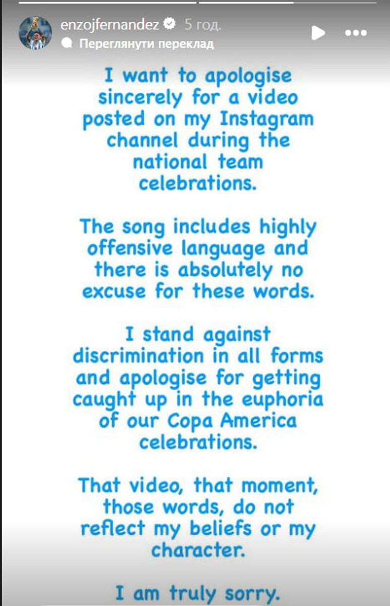 "Я хочу щиро вибачитися за відео, опубліковане на моєму акаунті в інстаграмі під час святкування національної збірної.