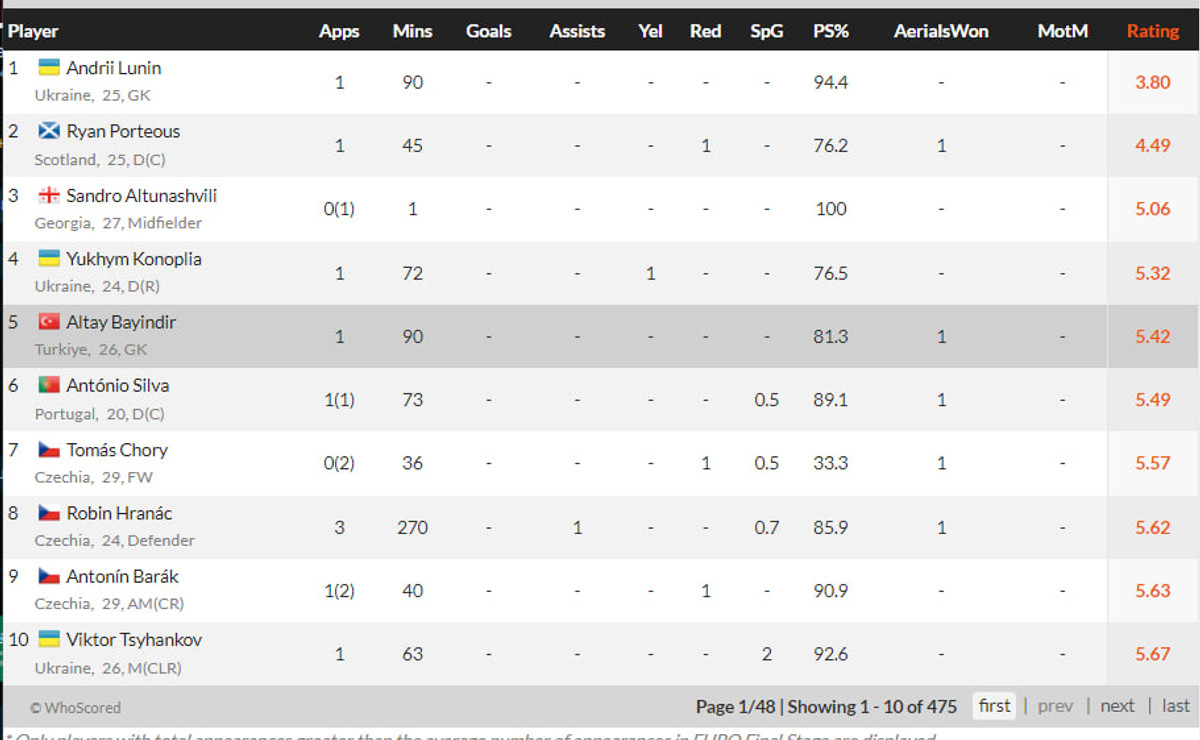 Зазначимо, що відповідні гравці брали участь лише у провальному матчі проти Румунії, тому їх оцінка за цей поєдинок і стала середньою на Євро.